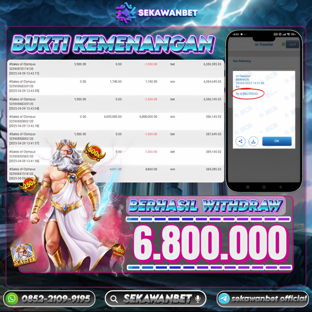 Selamat kepada User id : N*****21 Telah berhasil mendapatkan kemenangan besar pada permainan slot GATES OF OLYMPUS kemenangan Sebesar Rp.6.800.000, Setelah mengisi formulir withdraw dengan kurung waktu hanya 5 – 10 menit pihak sekawanbet sudah melakukan transfer kepada pemilik Userid dan dana sudah dapat di cairkan oleh pemenang. Bukti pembayaran yang kami berikan merupakan bukti pembayaran yang SAH / VALID yang langung di dapatkan melalui tanda transfer transaksi dari Bank yang di tuju.