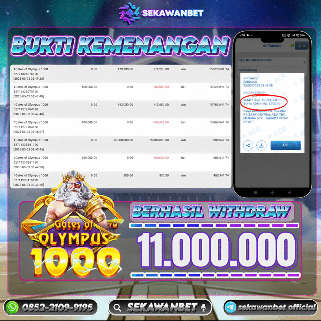Selamat kepada User id : R*****66 Telah berhasil mendapatkan kemenangan besar pada permainan slot GATES OF OLYMPUS 1000 kemenangan Sebesar Rp.11.000.000, Setelah mengisi formulir withdraw dengan kurung waktu hanya 5 – 10 menit pihak sekawanbet sudah melakukan transfer kepada pemilik Userid dan dana sudah dapat di cairkan oleh pemenang. Bukti pembayaran yang kami berikan merupakan bukti pembayaran yang SAH / VALID yang langung di dapatkan melalui tanda transfer transaksi dari Bank yang di tuju.