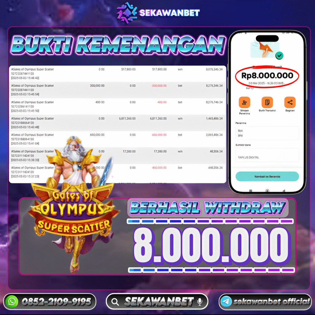 Selamat kepada User id : B*****TO Telah berhasil mendapatkan kemenangan besar pada permainan slot GATES OF OLYMPUS SUPER SCATTER kemenangan Sebesar Rp.8.000.000, Setelah mengisi formulir withdraw dengan kurung waktu hanya 5 – 10 menit pihak sekawanbet sudah melakukan transfer kepada pemilik Userid dan dana sudah dapat di cairkan oleh pemenang. Bukti pembayaran yang kami berikan merupakan bukti pembayaran yang SAH / VALID yang langung di dapatkan melalui tanda transfer transaksi dari Bank yang di tuju.