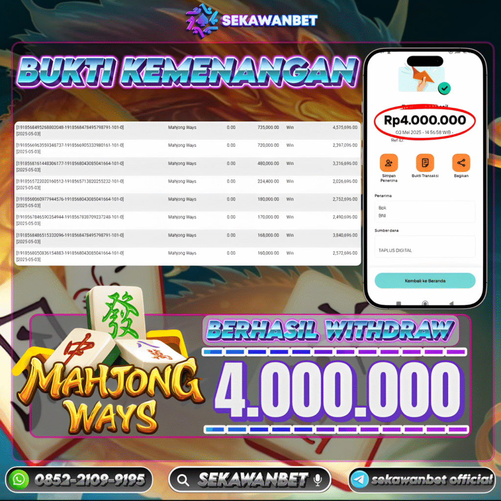 Selamat kepada User id : B*****TO Telah berhasil mendapatkan kemenangan besar pada permainan slot MAHJONG WAYS kemenangan Sebesar Rp.4.000.000, Setelah mengisi formulir withdraw dengan kurung waktu hanya 5 – 10 menit pihak sekawanbet sudah melakukan transfer kepada pemilik Userid dan dana sudah dapat di cairkan oleh pemenang. Bukti pembayaran yang kami berikan merupakan bukti pembayaran yang SAH / VALID yang langung di dapatkan melalui tanda transfer transaksi dari Bank yang di tuju.