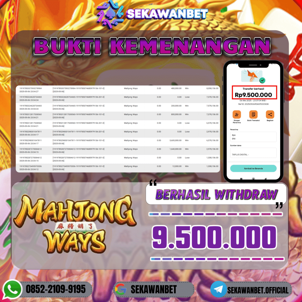 Selamat kepada User id : B*****TO Telah berhasil mendapatkan kemenangan besar pada permainan slot MAHJONG WAYS kemenangan Sebesar Rp.9.500.000, Setelah mengisi formulir withdraw dengan kurung waktu hanya 5 – 10 menit pihak sekawanbet sudah melakukan transfer kepada pemilik Userid dan dana sudah dapat di cairkan oleh pemenang. Bukti pembayaran yang kami berikan merupakan bukti pembayaran yang SAH / VALID yang langung di dapatkan melalui tanda transfer transaksi dari Bank yang di tuju.