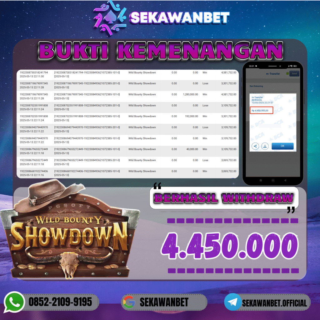 Selamat kepada User id : W*****ET Telah berhasil mendapatkan kemenangan besar pada permainan slot WILD BOUNTY SHOWDOWN kemenangan Sebesar Rp.4.450.000, Setelah mengisi formulir withdraw dengan kurung waktu hanya 5 – 10 menit pihak sekawanbet sudah melakukan transfer kepada pemilik Userid dan dana sudah dapat di cairkan oleh pemenang. Bukti pembayaran yang kami berikan merupakan bukti pembayaran yang SAH / VALID yang langung di dapatkan melalui tanda transfer transaksi dari Bank yang di tuju.