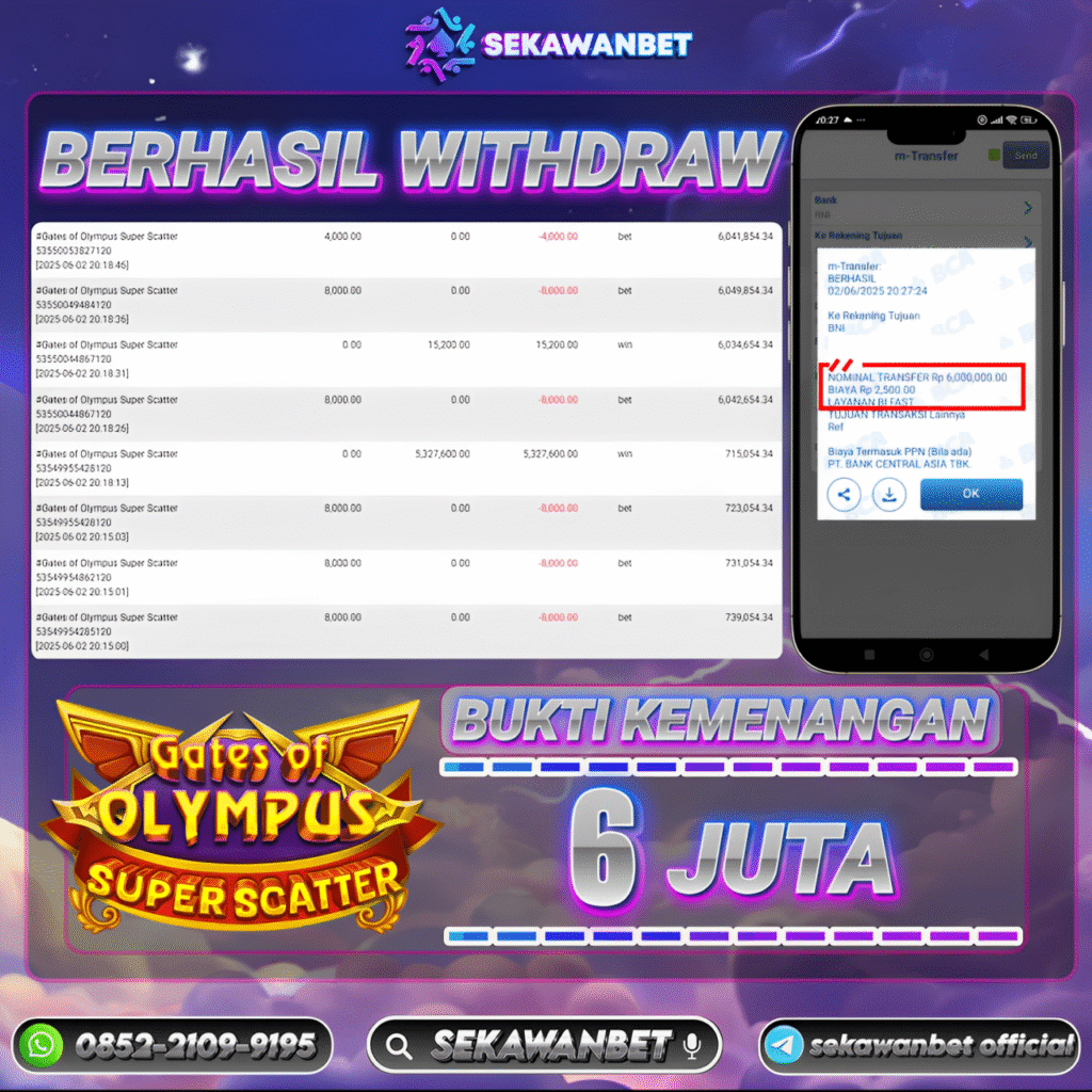 Selamat kepada User id : B*****TO Telah berhasil mendapatkan kemenangan besar pada permainan slot GATES OF OLYMPUS SUPER SCATTER  kemenangan Sebesar Rp.6.000.000, Setelah mengisi formulir withdraw dengan kurung waktu hanya 5 – 10 menit pihak sekawanbet sudah melakukan transfer kepada pemilik Userid dan dana sudah dapat di cairkan oleh pemenang. Bukti pembayaran yang kami berikan merupakan bukti pembayaran yang SAH / VALID yang langung di dapatkan melalui tanda transfer transaksi dari Bank yang di tuju.