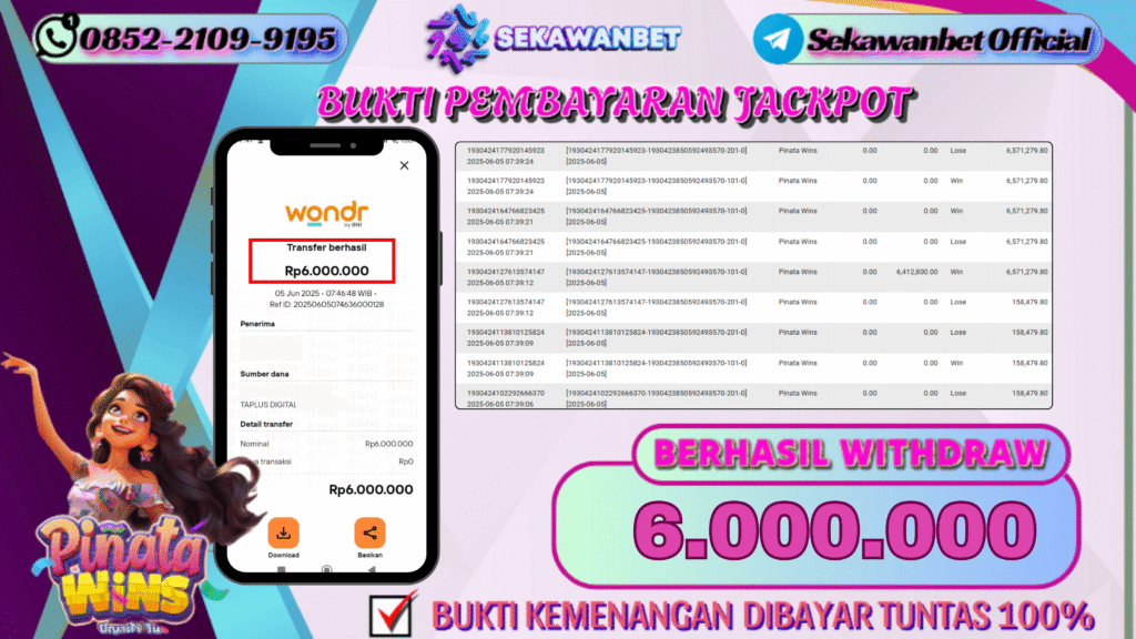 Selamat kepada User id : B*****TO Telah berhasil mendapatkan kemenangan besar pada permainan slot PINATA WINS kemenangan Sebesar Rp.6.000.000, Setelah mengisi formulir withdraw dengan kurung waktu hanya 5 – 10 menit pihak sekawanbet sudah melakukan transfer kepada pemilik Userid dan dana sudah dapat di cairkan oleh pemenang. Bukti pembayaran yang kami berikan merupakan bukti pembayaran yang SAH / VALID yang langung di dapatkan melalui tanda transfer transaksi dari Bank yang di tuju.