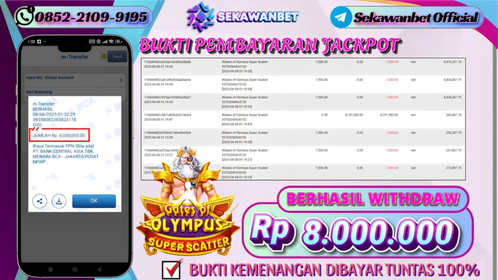 Selamat kepada User id : B*****YZ Telah berhasil mendapatkan kemenangan besar pada permainan slot GATES OF OLYMPUS SUPER SCATTER kemenangan Sebesar Rp.8.000.000, Setelah mengisi formulir withdraw dengan kurung waktu hanya 5 – 10 menit pihak sekawanbet sudah melakukan transfer kepada pemilik Userid dan dana sudah dapat di cairkan oleh pemenang. Bukti pembayaran yang kami berikan merupakan bukti pembayaran yang SAH / VALID yang langung di dapatkan melalui tanda transfer transaksi dari Bank yang di tuju.