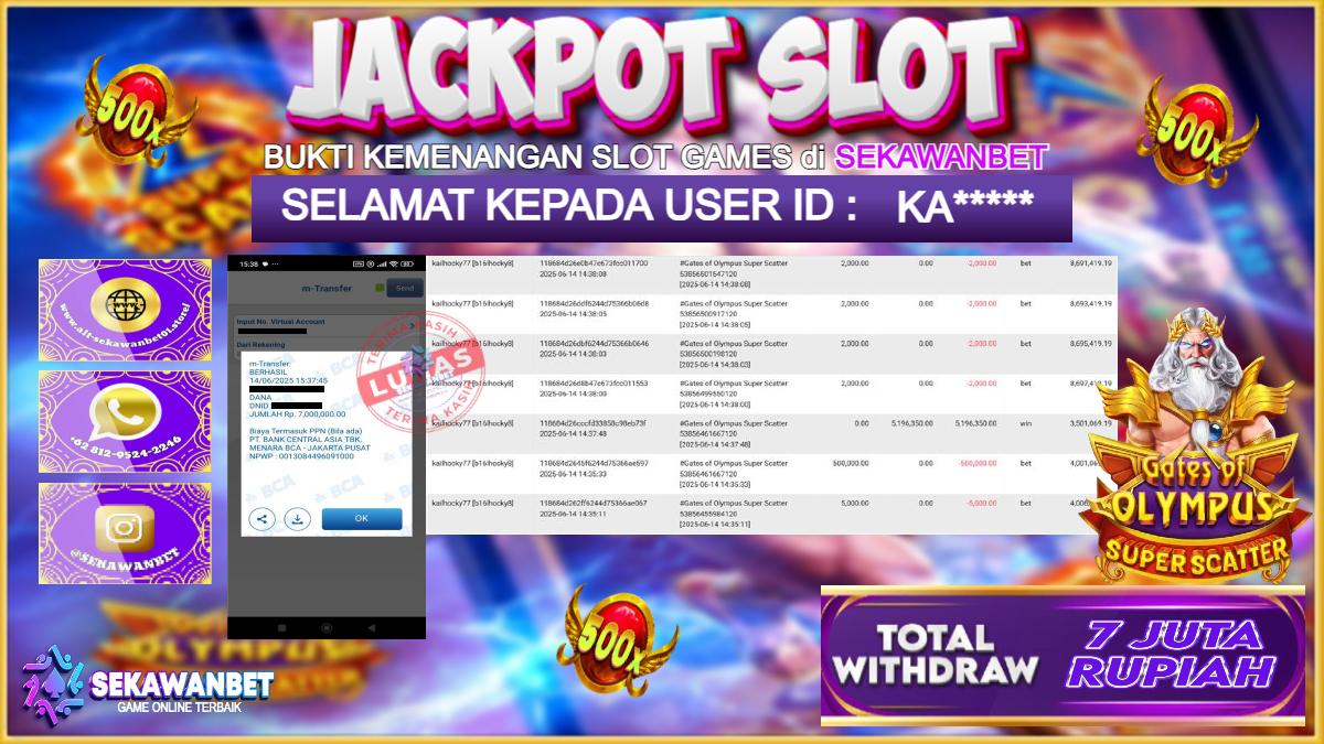Selamat kepada User id : KA***** Telah berhasil mendapatkan kemenangan besar pada permainan slot GATES OF OLYMPUS SUPER SCATTER kemenangan Sebesar Rp.7.000.000, Setelah mengisi formulir withdraw dengan kurung waktu hanya 5 – 10 menit pihak sekawanbet sudah melakukan transfer kepada pemilik Userid dan dana sudah dapat di cairkan oleh pemenang. Bukti pembayaran yang kami berikan merupakan bukti pembayaran yang SAH / VALID yang langung di dapatkan melalui tanda transfer transaksi dari Bank yang di tuju.