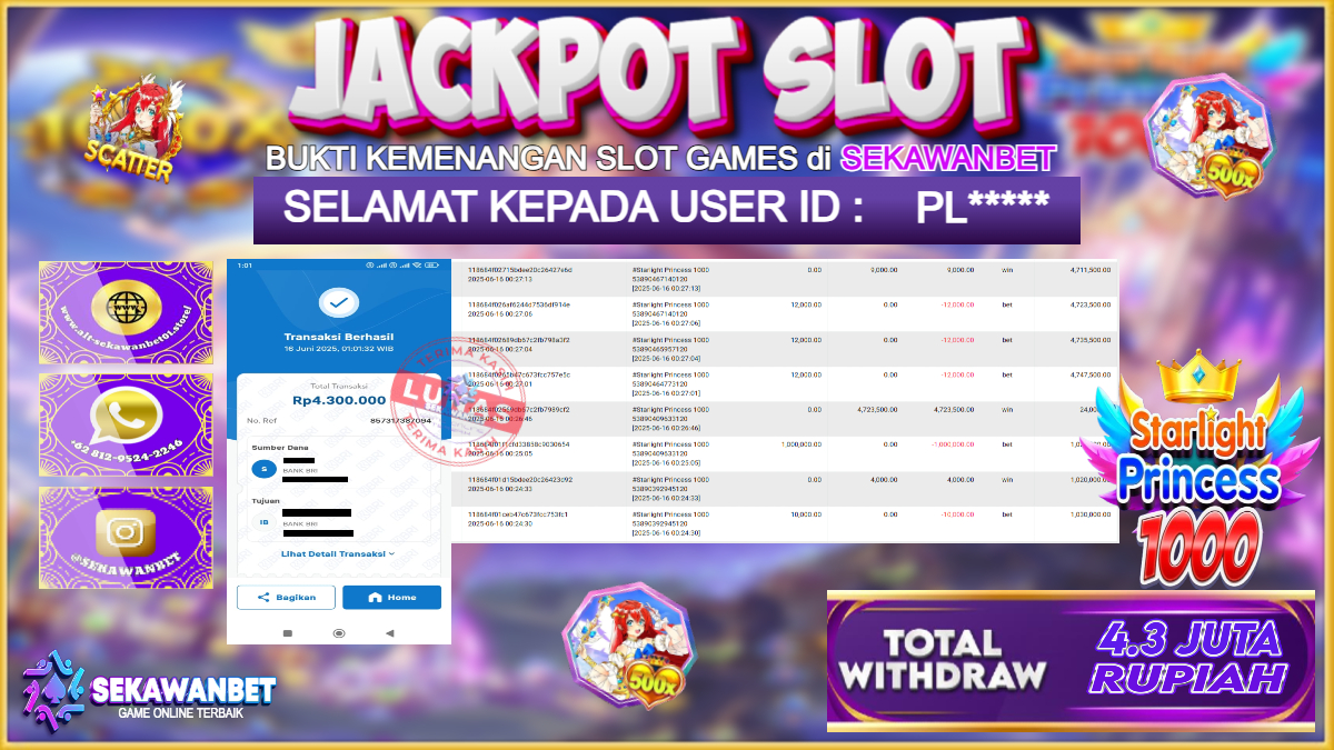 Selamat kepada User id :Ā PL*****Ā TelahĀ berhasilĀ mendapatkan kemenangan besar pada permainan slotĀ STARLIGHT PRINCESS 1000Ā kemenangan SebesarĀ Rp.4.300.000,Ā Setelah mengisi formulir withdraw dengan kurung waktu hanya 5 ā 10 menit pihakĀ sekawanbetĀ sudah melakukan transfer kepada pemilik Userid dan dana sudah dapat di cairkan oleh pemenang.Ā Bukti pembayaran yang kami berikan merupakan bukti pembayaran yangĀ SAH / VALIDĀ yang langung di dapatkan melalui tanda transfer transaksi dari Bank yang diĀ tuju.