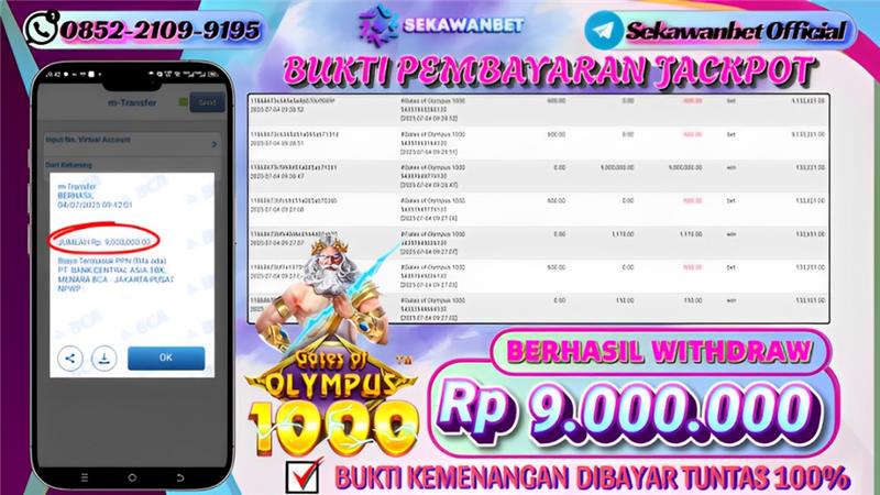 Selamat kepada User id : ME***** Telah berhasil mendapatkan kemenangan besar pada permainan slot GATES OF OLYMPUS 1000 kemenangan Sebesar Rp.9.000.000, Setelah mengisi formulir withdraw dengan kurung waktu hanya 5 – 10 menit pihak sekawanbet sudah melakukan transfer kepada pemilik Userid dan dana sudah dapat di cairkan oleh pemenang. Bukti pembayaran yang kami berikan merupakan bukti pembayaran yang SAH / VALID yang langung di dapatkan melalui tanda transfer transaksi dari Bank yang di tuju.
