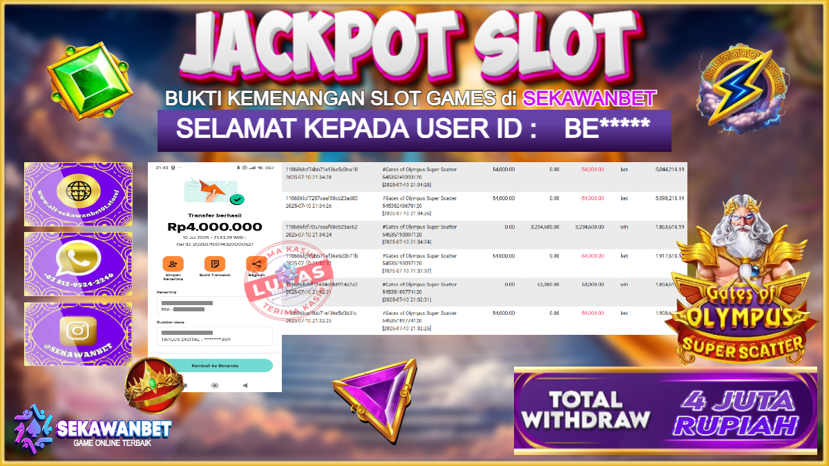 Selamat kepada User id : BE***** Telah berhasil mendapatkan kemenangan besar pada permainan slot GATES OF OLYMPUS SUPER SCATTER kemenangan Sebesar Rp.4.000.000, Setelah mengisi formulir withdraw dengan kurung waktu hanya 5 – 10 menit pihak sekawanbet sudah melakukan transfer kepada pemilik Userid dan dana sudah dapat di cairkan oleh pemenang. Bukti pembayaran yang kami berikan merupakan bukti pembayaran yang SAH / VALID yang langung di dapatkan melalui tanda transfer transaksi dari Bank yang di tuju.