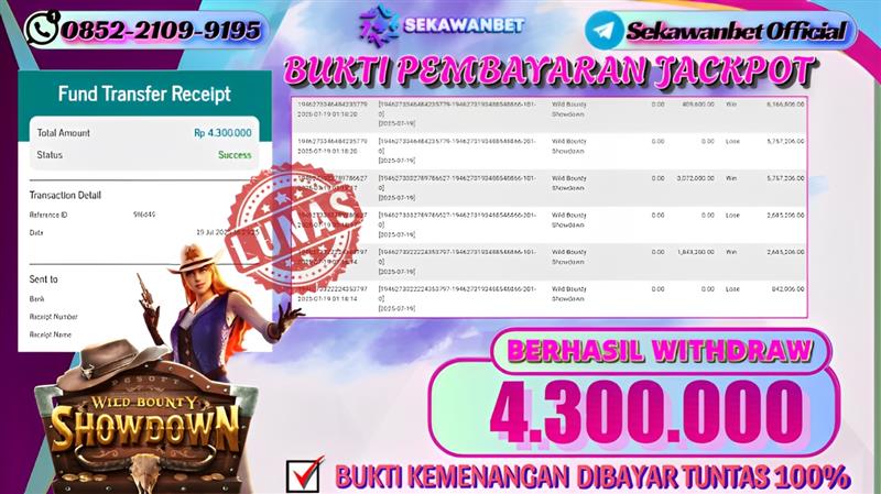 Selamat kepada User id : AN***** Telah berhasil mendapatkan kemenangan besar pada permainan slot WILD BOUNTY SHOWDOWN kemenangan Sebesar Rp.4.300.000, Setelah mengisi formulir withdraw dengan kurung waktu hanya 5 – 10 menit pihak sekawanbet sudah melakukan transfer kepada pemilik Userid dan dana sudah dapat di cairkan oleh pemenang. Bukti pembayaran yang kami berikan merupakan bukti pembayaran yang SAH / VALID yang langung di dapatkan melalui tanda transfer transaksi dari Bank yang di tuju.