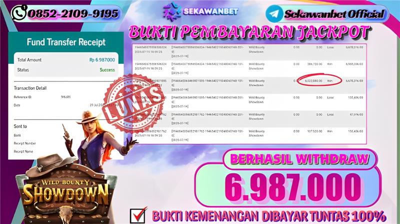 Selamat kepada User id : JP***** Telah berhasil mendapatkan kemenangan besar pada permainan slot WILD BOUNTY SHOWDOWN kemenangan Sebesar Rp.6.987.000, Setelah mengisi formulir withdraw dengan kurung waktu hanya 5 – 10 menit pihak sekawanbet sudah melakukan transfer kepada pemilik Userid dan dana sudah dapat di cairkan oleh pemenang. Bukti pembayaran yang kami berikan merupakan bukti pembayaran yang SAH / VALID yang langung di dapatkan melalui tanda transfer transaksi dari Bank yang di tuju.