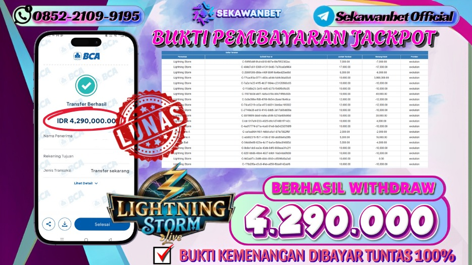 Selamat kepada User id : PE***** Telah berhasil mendapatkan kemenangan besar pada permainan slot LIGHTNING STROM kemenangan Sebesar Rp.4.290.000, Setelah mengisi formulir withdraw dengan kurung waktu hanya 5 – 10 menit pihak sekawanbet sudah melakukan transfer kepada pemilik Userid dan dana sudah dapat di cairkan oleh pemenang. Bukti pembayaran yang kami berikan merupakan bukti pembayaran yang SAH / VALID yang langung di dapatkan melalui tanda transfer transaksi dari Bank yang di tuju.