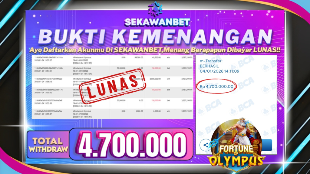 Selamat kepada User id : CA***** Telah berhasil mendapatkan kemenangan besar pada permainan slot FORTUNE OF OLYMPUS kemenangan Sebesar Rp.4.700.000, Setelah mengisi formulir withdraw dengan kurung waktu hanya 5 – 10 menit pihak sekawanbet sudah melakukan transfer kepada pemilik Userid dan dana sudah dapat di cairkan oleh pemenang. Bukti pembayaran yang kami berikan merupakan bukti pembayaran yang SAH / VALID yang langung di dapatkan melalui tanda transfer transaksi dari Bank yang di tuju.