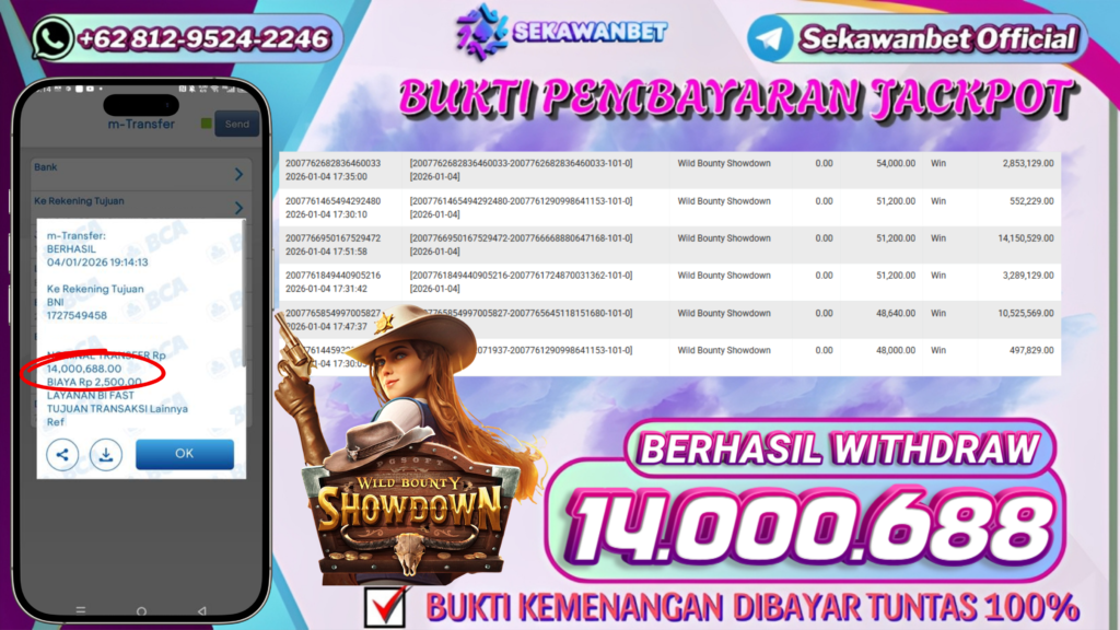 Selamat kepada User id : PA***** Telah berhasil mendapatkan kemenangan besar pada permainan slot WILD BOUNTY SHOWDOWN kemenangan Sebesar Rp.14.000.688, Setelah mengisi formulir withdraw dengan kurung waktu hanya 5 – 10 menit pihak sekawanbet sudah melakukan transfer kepada pemilik Userid dan dana sudah dapat di cairkan oleh pemenang. Bukti pembayaran yang kami berikan merupakan bukti pembayaran yang SAH / VALID yang langung di dapatkan melalui tanda transfer transaksi dari Bank yang di tuju.