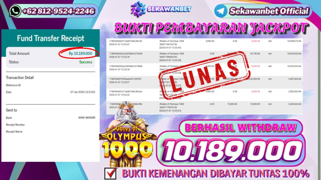 Selamat kepada User id : NU***** Telah berhasil mendapatkan kemenangan besar pada permainan slot GATES OF OLYMPUS 1000 kemenangan Sebesar Rp.10.189.000, Setelah mengisi formulir withdraw dengan kurung waktu hanya 5 – 10 menit pihak sekawanbet sudah melakukan transfer kepada pemilik Userid dan dana sudah dapat di cairkan oleh pemenang. Bukti pembayaran yang kami berikan merupakan bukti pembayaran yang SAH / VALID yang langung di dapatkan melalui tanda transfer transaksi dari Bank yang di tuju.