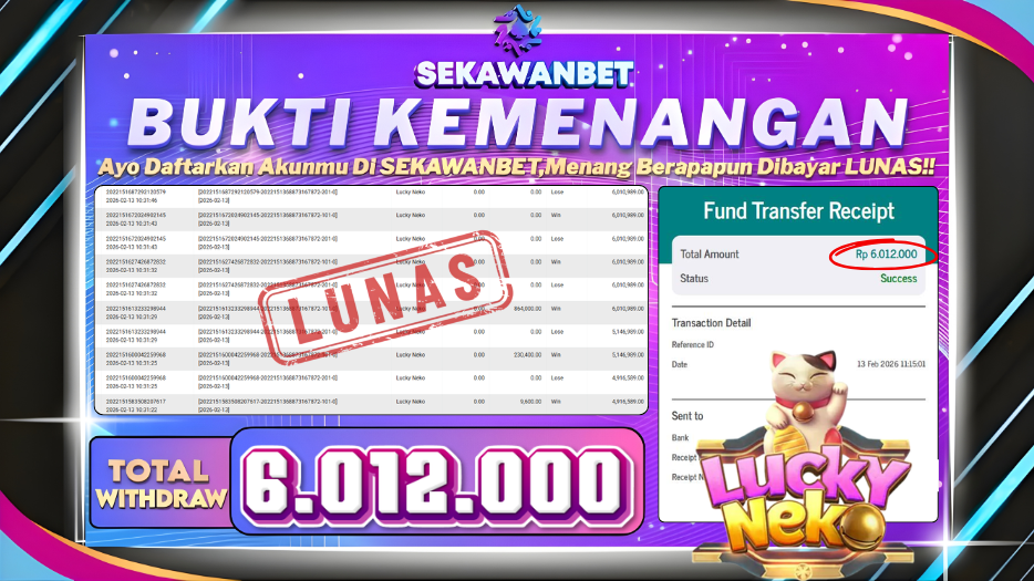 Selamat kepada User id : JP***** Telah berhasil mendapatkan kemenangan besar pada permainan slot LUCKY NEKO kemenangan Sebesar Rp.6.012.000, Setelah mengisi formulir withdraw dengan kurung waktu hanya 5 – 10 menit pihak sekawanbet sudah melakukan transfer kepada pemilik Userid dan dana sudah dapat di cairkan oleh pemenang. Bukti pembayaran yang kami berikan merupakan bukti pembayaran yang SAH / VALID yang langung di dapatkan melalui tanda transfer transaksi dari Bank yang di tuju.