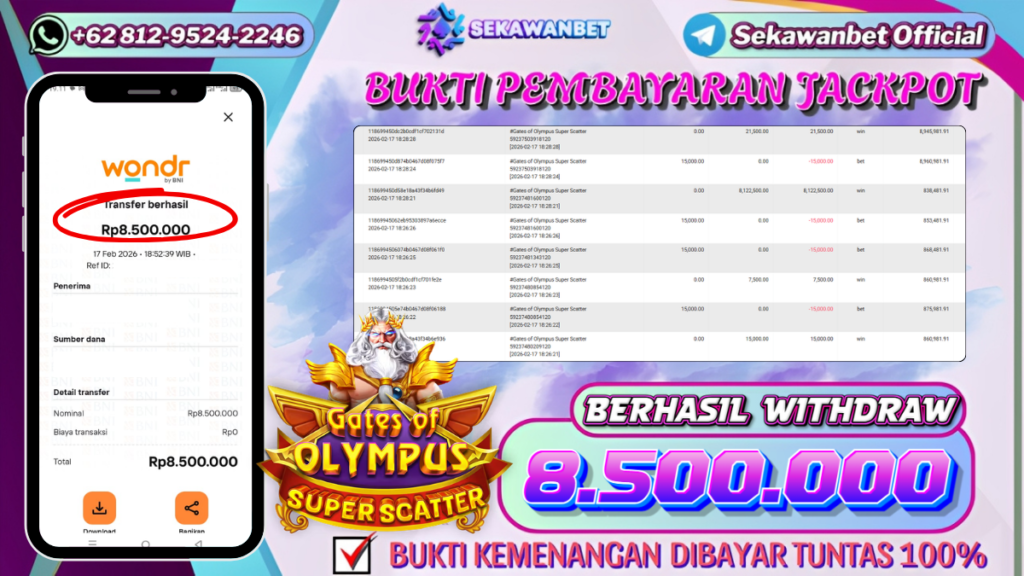 Selamat kepada User id : BE***** Telah berhasil mendapatkan kemenangan besar pada permainan slot GATES OF OLYMPUS SUPER SCATTER kemenangan Sebesar Rp.8.500.000, Setelah mengisi formulir withdraw dengan kurung waktu hanya 5 – 10 menit pihak sekawanbet sudah melakukan transfer kepada pemilik Userid dan dana sudah dapat di cairkan oleh pemenang. Bukti pembayaran yang kami berikan merupakan bukti pembayaran yang SAH / VALID yang langung di dapatkan melalui tanda transfer transaksi dari Bank yang di tuju.