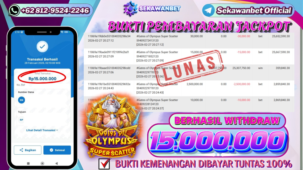 Selamat kepada User id : RY***** Telah berhasil mendapatkan kemenangan besar pada permainan slot GATES OF OLYMPUS SUPER SCATTER kemenangan Sebesar Rp.15.000.000, Setelah mengisi formulir withdraw dengan kurung waktu hanya 5 – 10 menit pihak sekawanbet sudah melakukan transfer kepada pemilik Userid dan dana sudah dapat di cairkan oleh pemenang. Bukti pembayaran yang kami berikan merupakan bukti pembayaran yang SAH / VALID yang langung di dapatkan melalui tanda transfer transaksi dari Bank yang di tuju.