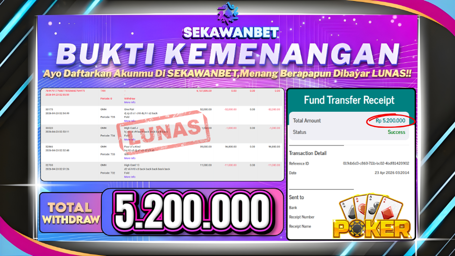 Selamat kepada User id : YE***** Telah berhasil mendapatkan kemenangan besar pada permainan slot POKER kemenangan Sebesar Rp.5.200.000, Setelah mengisi formulir withdraw dengan kurung waktu hanya 5 – 10 menit pihak sekawanbet sudah melakukan transfer kepada pemilik Userid dan dana sudah dapat di cairkan oleh pemenang. Bukti pembayaran yang kami berikan merupakan bukti pembayaran yang SAH / VALID yang langung di dapatkan melalui tanda transfer transaksi dari Bank yang di tuju.