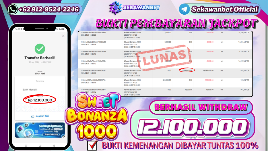 Selamat kepada User id : AD***** Telah berhasil mendapatkan kemenangan besar pada permainan slot SWEET BONANZA 1000  kemenangan Sebesar Rp.12.100.000, Setelah mengisi formulir withdraw dengan kurung waktu hanya 5 – 10 menit pihak sekawanbet sudah melakukan transfer kepada pemilik Userid dan dana sudah dapat di cairkan oleh pemenang. Bukti pembayaran yang kami berikan merupakan bukti pembayaran yang SAH / VALID yang langung di dapatkan melalui tanda transfer transaksi dari Bank yang di tuju.