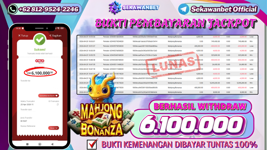 Selamat kepada User id : AD***** Telah berhasil mendapatkan kemenangan besar pada permainan slot MAHJONG BONANZA   kemenangan Sebesar Rp.6.100.000, Setelah mengisi formulir withdraw dengan kurung waktu hanya 5 – 10 menit pihak sekawanbet sudah melakukan transfer kepada pemilik Userid dan dana sudah dapat di cairkan oleh pemenang. Bukti pembayaran yang kami berikan merupakan bukti pembayaran yang SAH / VALID yang langung di dapatkan melalui tanda transfer transaksi dari Bank yang di tuju.