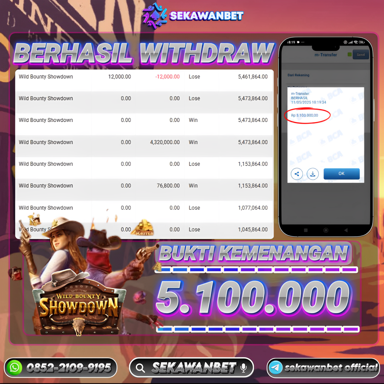 Selamat kepada User id : N*****AN Telah berhasil mendapatkan kemenangan besar pada permainan slot WILD BOUNTY SHOWDOWN kemenangan Sebesar Rp.5.100.000, Setelah mengisi formulir withdraw dengan kurung waktu hanya 5 – 10 menit pihak sekawanbet sudah melakukan transfer kepada pemilik Userid dan dana sudah dapat di cairkan oleh pemenang. Bukti pembayaran yang kami berikan merupakan bukti pembayaran yang SAH / VALID yang langung di dapatkan melalui tanda transfer transaksi…