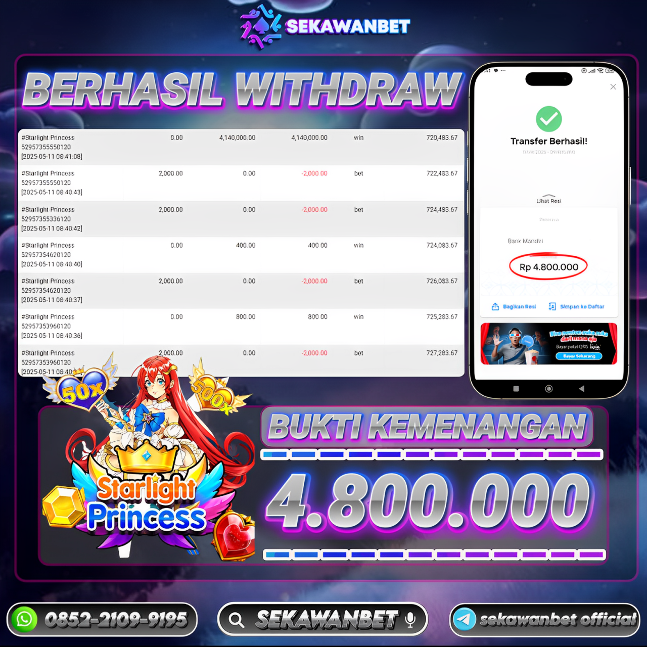 Selamat kepada User id : J*****AN Telah berhasil mendapatkan kemenangan besar pada permainan slot STARLIGHT PRINCESS  kemenangan Sebesar Rp.4.800.000, Setelah mengisi formulir withdraw dengan kurung waktu hanya 5 – 10 menit pihak sekawanbet sudah melakukan transfer kepada pemilik Userid dan dana sudah dapat di cairkan oleh pemenang. Bukti pembayaran yang kami berikan merupakan bukti pembayaran yang SAH / VALID yang langung di dapatkan melalui tanda transfer transaksi…